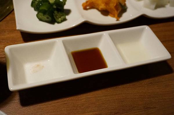 分別是海鹽,燒肉醬,還有白醋
